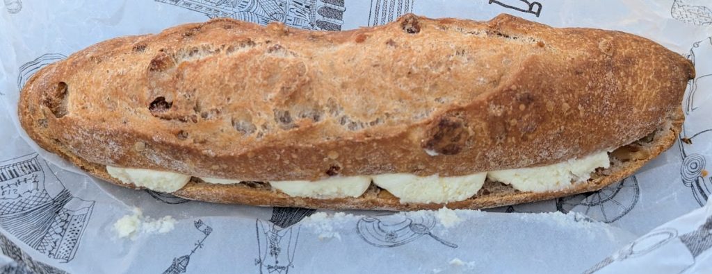 ひと口目は、バゲットの程よい塩気と香ばしいクルミのカリッと感。続いてふわっとミルクの甘さが広がって、甘じょっぱさの波が交互に押し寄せてくるタイプ。クリームはたっぷりでコクがあるのに後味は重くなくておいしいです。
