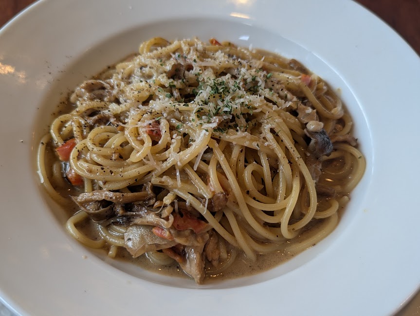 私がメインで注文したのは、国産豚ときのこのポルチーニクリームソースです。国産豚のソテーに、フライした舞茸としめじが添えられ、ポルチーニが香るクリームソースとパルミジャーノレジャーノで仕上げた一皿です。