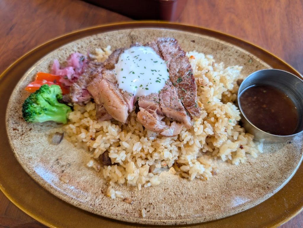 夫は、100gアンガスサーロインステーキ&ガーリックピラフを注文しました。ガーリックバターとだし醤油の風味が効いたピラフは、香りだけで食欲をそそります。