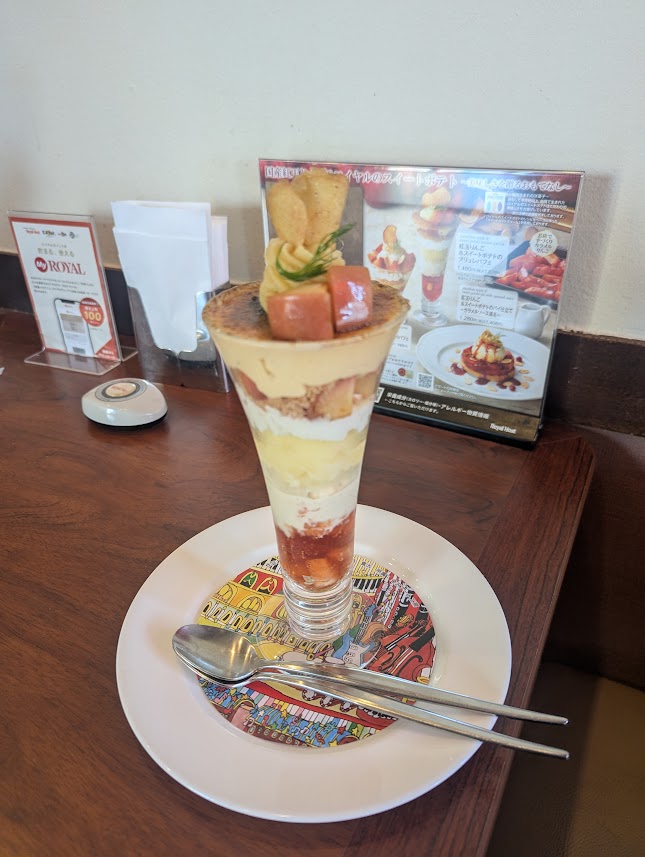 先日、ロイヤルホストで「紅玉りんご&スイートポテトのブリュレパフェ」を食べてきました。税込みで1,628円。普段から甘いものは好きだけれど、これは特別。ひと口食べただけで「また食べたい」と思うほどのおいしさでした。