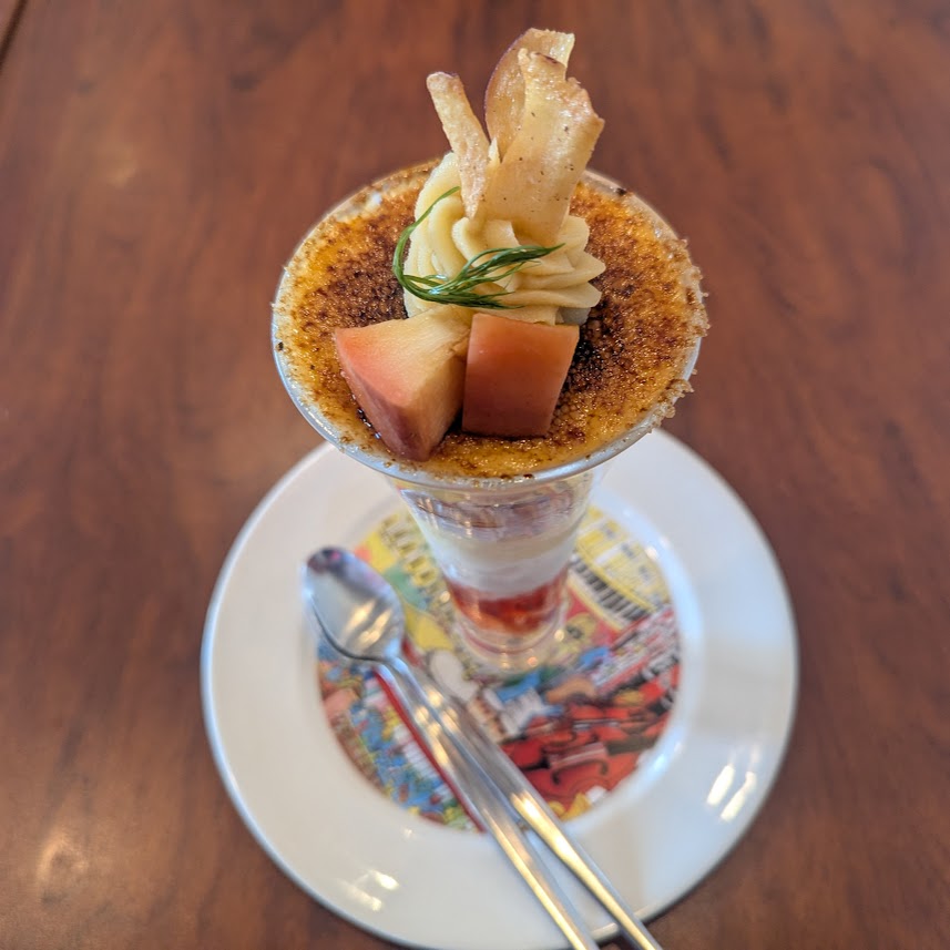その下には、店で仕込んだカラメルりんごと、スイートポテトクリーム。あたたかみのある甘さが、ブリュレのコクとよく合います。そしてアイスクリーム、りんごソルベ、チャイ風ゼリー、バニラアイスなど、冷たくて軽やかな層が続くことで、食べ進めるたびに味と食感が変化。最初の「濃厚」から、中盤の「さっぱり」、最後の「すっきり」まで、飽きずにおいしさを楽しめました。