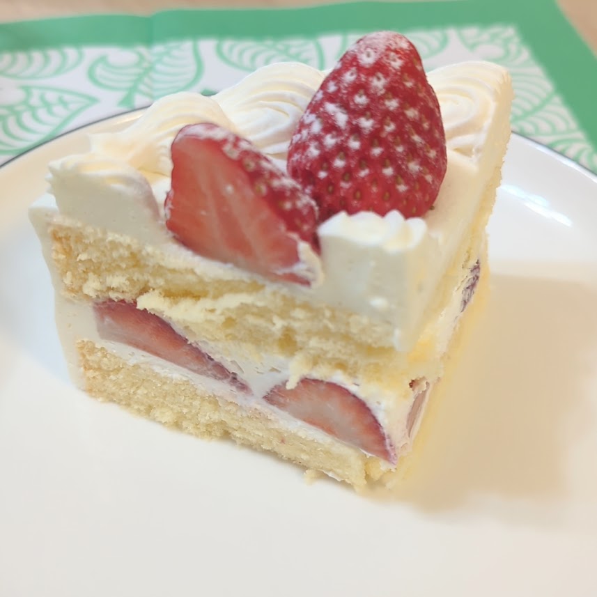 食べてまず感動したのは、やはりいちごでした。さすが果物屋さんのケーキという感じで、甘さと酸味のバランスがとてもよく、いちごそのものがしっかりおいしいです。ケーキの中に入っているいちごも、上にのっているいちごも、どちらも主役級でした。