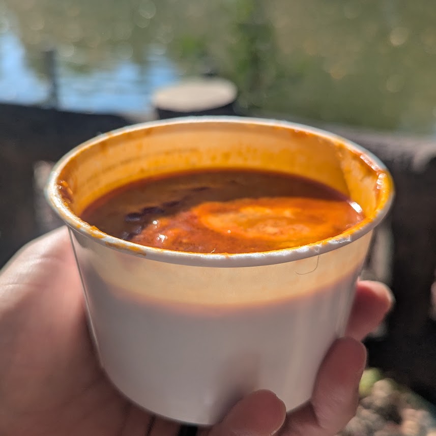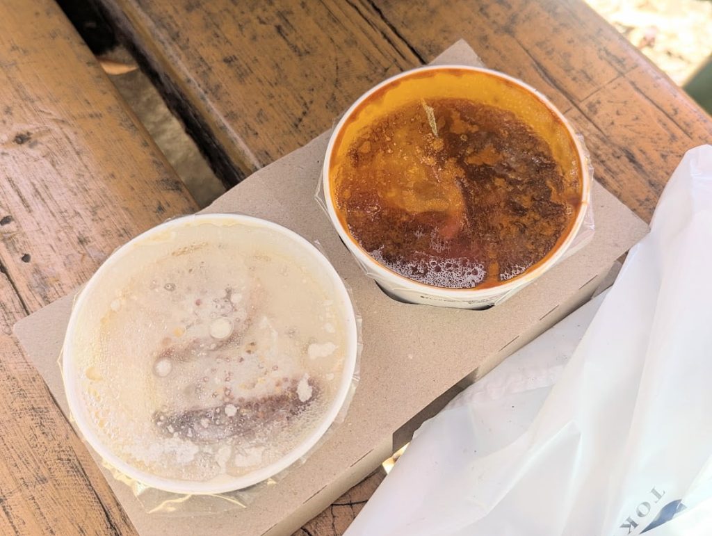 テイクアウトのスープはカップにラップをして提供されます。屋外で食べるとどうしても冷めやすく、冬のピクニックでは特に早めに食べることを意識したほうがよいです。店舗で食べるときよりも、スープの量や具材の存在感が少なく感じました。持ち運びの影響や提供時の状態によるものかもしれませんが、いつも店内で味わうときとの違いを感じることがありました。
