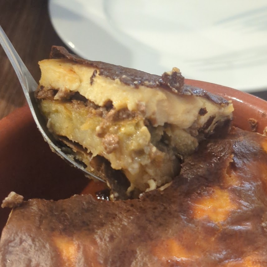 ムサカは、茄子とじゃがいもをベースに、卵やチーズを重ねて焼き上げた料理で、日本の家庭料理や洋食とはまた違う、地中海らしい味と食感。