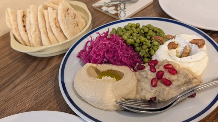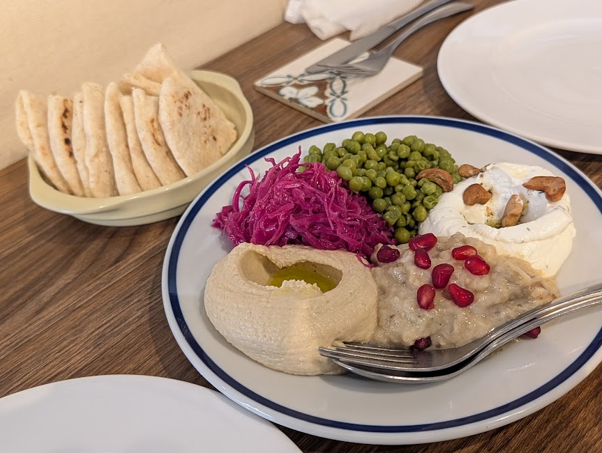 メゼはとくに印象的で、ヨーグルトディップのハイダリ、ひよこ豆のディップ・フムス、焼きなすのディップ・ババガヌージ、グリンピースのオイル煮、紫キャベツのサラダがワンプレートになっていて、それにピタパンがついていました。パンをディップにつけて食べるスタイルで、野菜や豆中心のやさしい味わいが印象的でした。