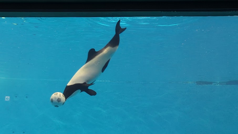 ボールで遊ぶイロワケイルカ。ボールも白黒。