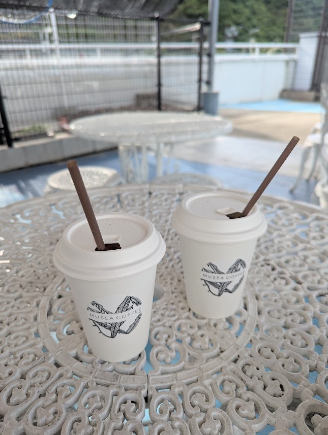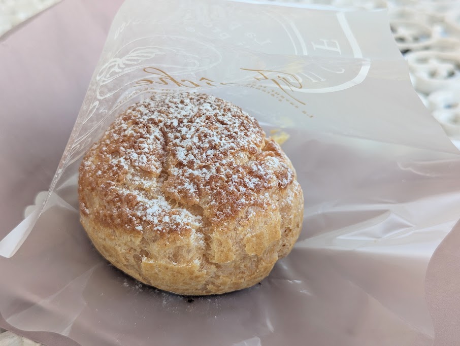私はカフェラテ、夫は紅茶。館内の飲食OKスペースでシュークリームと一緒にひと息。疲れたところに甘いものとドリンクでリフレッシュ。