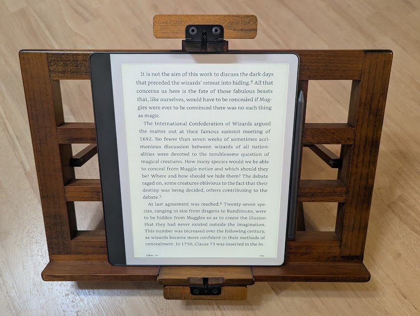私はこの書見台を使って、電子書籍リーダー Amazon の Kindle Scribe でも読書をしています。Kindle の画面は見やすくて便利だけど、手で持って長時間読むと疲れやすかった。でもこの書見台に乗せると、まるで机の上で紙の本をゆっくり読むような感覚になって、とても快適です。